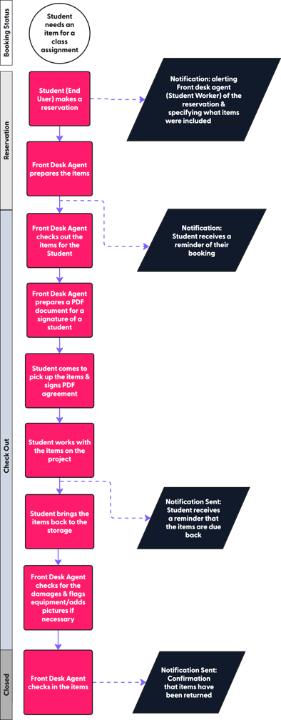 The Use Case: Students reserve items for a class assignment. Front Desk Agents (Student Workers) prepare the items and check them out for to the student.