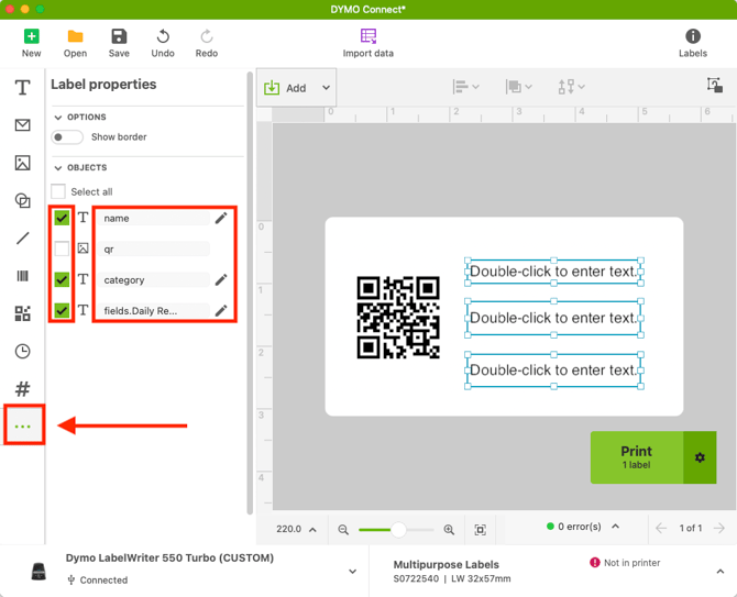 - Rename your template by clicking into the name field - by default it will be set to "Dymo Template"